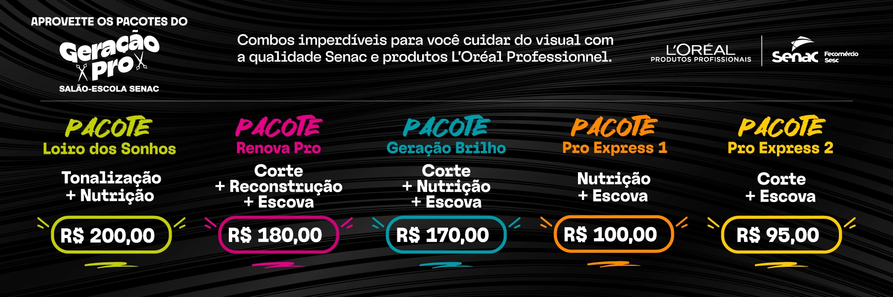 O Salão Escola Senac Geração Pro é um espaço com estrutura moderna onde o público pode cuidar do visual com serviços de qualidade e preços acessíveis, localizado no 2º piso do Shopping Conjunto Nacional. Entre os serviços disponíveis estão escova, chapinha, babyliss, nutrição capilar, reconstrução, coloração e cortes femininos e masculinos