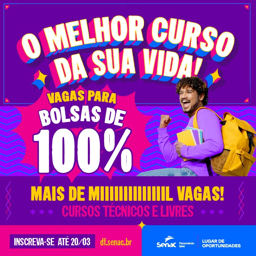 O Senac-DF está com inscrições abertas para mais de mil vagas em cursos livres, com bolsas de estudo que podem cobrir até 100% do valor. As oportunidades são para o segundo trimestre de 2025 e as inscrições seguem até o dia 20 de março.